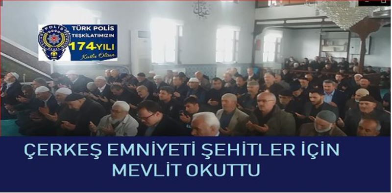 Çerkeş İlçe Emniyet Müdürlüğü tarafından 10 Nisan Polis Haftası etkinlikleri kapsamında şehit polisler ve tüm şehitler adına 4 MURAT (çarşı camii) de mevlit okutuldu. Türk Polis Teşkilatı'nın 174. kuruluş yıl dönümü nedeniyle Çerkeş İlçe Emniyet Müdürlüğü şehitleri unutmadı Çerkeş (Merkez Çarşı)4 .Murat caminde düzenlenen Mevlid-i Şerif programına, Çerkeş Kaymakam Vekili Kemal Sefa Gökmenoğlu, İlçe Emniyet Müdür Vekili Soner Aydemir, ÇerkeşJandarma bölük komutanı Bayram Veyil ,Kurum Amirleri, İlçe Eminyet Teşkilatı, Emekli Polisler ve çok sayıda vatandaş katıldı.. İlçe Emniyet Müdürlüğü personeli, mevlidin ardından camiden çıkan vatandaşlara ikramda bulundu.