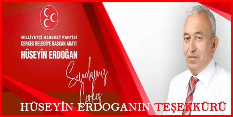MHP Çerkeş Belediyesi Başkan Adayı Hüseyin ERDOĞAN, seçim sonucunun belirlenmesinin ardından sonra yaptığı açıklamada, Çerkeş'in bugünkünden daha ileriye gitmesi için çalışmaya, katkı koymaya devam edeceğini belirtti, kendisini destekleyenlere teşekkür etti.