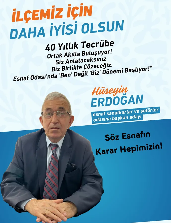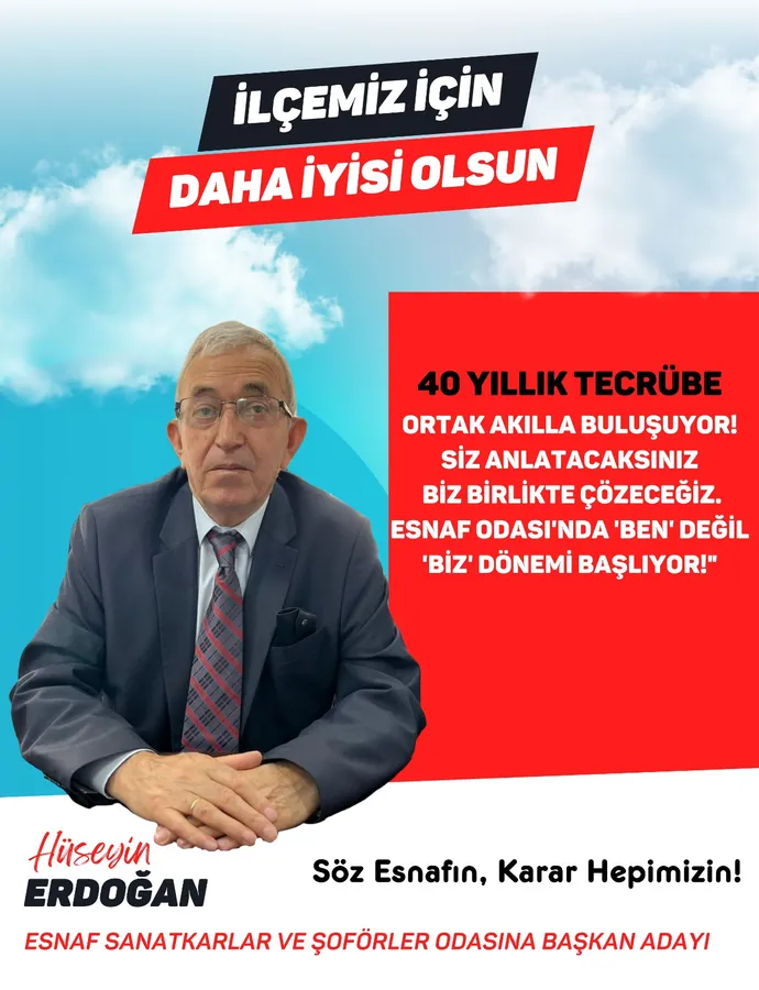 Erdoğan yaptığı açıklamada "40 Yıllık Tecrübe, Ortak Akılla Buluşuyor! Siz Anlatacaksınız, Biz Birlikte Çözeceğiz. Esnaf Odası'nda 'Ben' Değil, 'Biz' Dönemi Başlıyor, odanın sorunlarını konuşan değil çözen, uzaktan değil sahada olan bir anlayışla yönetilmesi gerektiğini vurguladı. “Bu oda bizim, bu meslek bizim” ifadelerini kullanan Hüseyin Erdoğan emeğin karşılığını alan ve emekçilerin söz sahibi olduğu bir oda için üyelerin desteğini istedi.