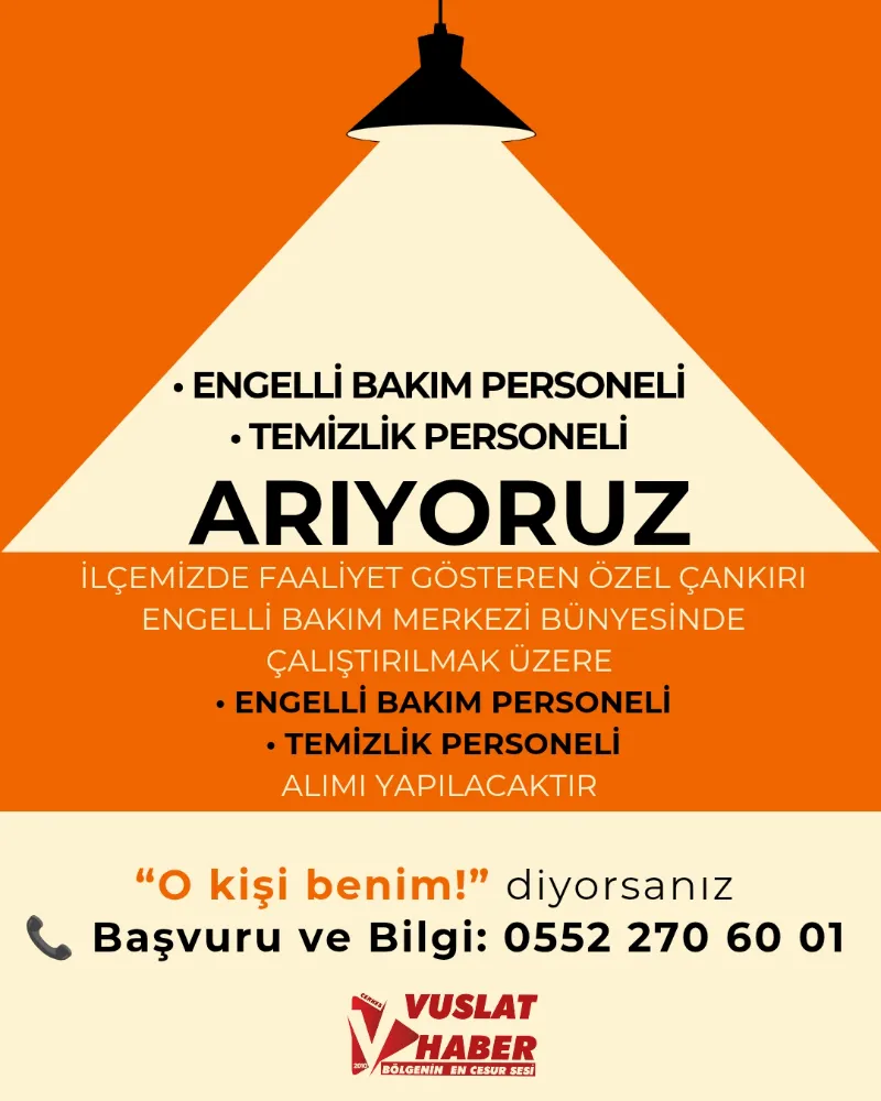 📢 İŞ İLANI İlçemizde faaliyet gösteren Özel Çankırı Engelli Bakım Merkezi bünyesinde çalıştırılmak üzere; • Engelli Bakım Personeli • Temizlik Personeli alımı yapılacaktır. 📍 Çalışma Yeri: Çerkeş / Çankırı 📞 Başvuru ve Bilgi: 0552 270 60 01