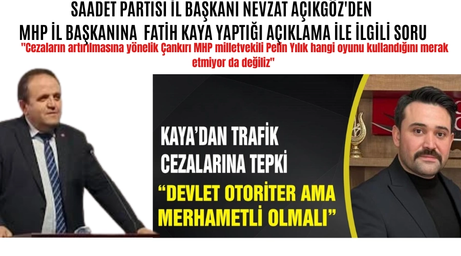 Açıkgöz, MHP Çankırı İl Başkanı Avukat Fatih Kaya'ya yönelik sert eleştirilerde bulundu. Özellikle trafik cezalarının artırılmasının, Milliyetçi Hareket Partisi (MHP) ve Adalet ve Kalkınma Partisi (AK Parti) oylarıyla Türkiye Büyük Millet Meclisi'nden geçtiğini vurguladı. Açıkgöz, bu cezaların kanunlaşmasının ardından Kaya'nın bu duruma tepkisiz kalmasını eleştirerek, "Cezaların artırılmasına yönelik Çankırı MHP milletvekili Pelin Yılık hangi oyunu kullandığını merak etmiyor da değiliz" şeklinde bir ifade kullandı.