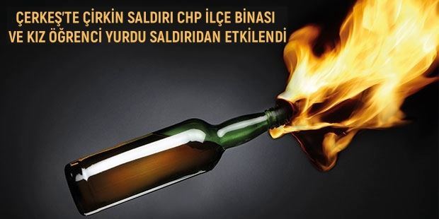 Çerkeş'te çirkin saldırı CHP ilçe binası ve kız öğrenci yurdu saldırıdan etkilendi. Çerkeş Akgün otel şimdiki Kız öğrenci pansiyonuna ve yanında bulunan Çerkeş CHP ilçe binasına Molotof kokteyli ile saldırdı yapıldı. Atılan Molotof kokteyli sonucu küçük çaplı yangın çıktı. Olay yerine gelen itfaiye ekipleri yangını kontrol altına Çerkeş emniyet müdürlüğü araştırma yapıyor.