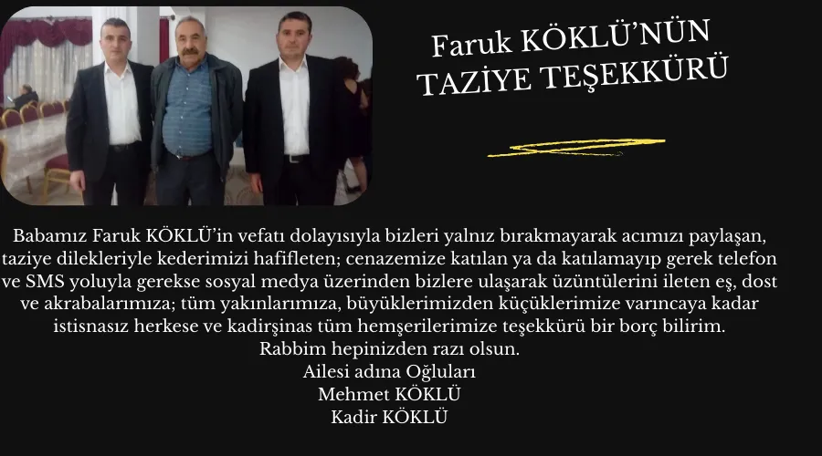 Babamız Faruk KÖKLÜ’in vefatı dolayısıyla bizleri yalnız bırakmayarak acımızı paylaşan, taziye dilekleriyle kederimizi hafifleten; cenazemize katılan ya da katılamayıp gerek telefon ve SMS yoluyla gerekse sosyal medya üzerinden bizlere ulaşarak üzüntülerini ileten eş, dost ve akrabalarımıza; tüm yakınlarımıza, büyüklerimizden küçüklerimize varıncaya kadar istisnasız herkese ve kadirşinas tüm hemşerilerimize teşekkürü bir borç bilirim.