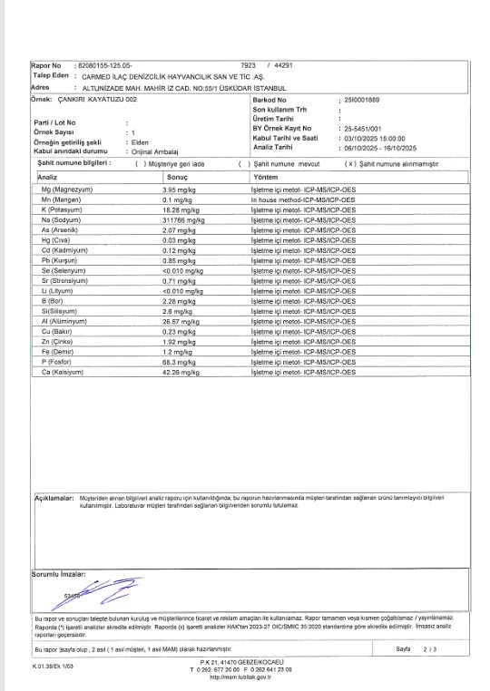 değerleri tespit edildi. Bu oranlar, binlerce yıldır yeraltında doğal filtrasyondan geçen, mineralli ve ağır metal oranı düşük saf Çankırı tuzunun karakteristik profilini yansıtıyor.
