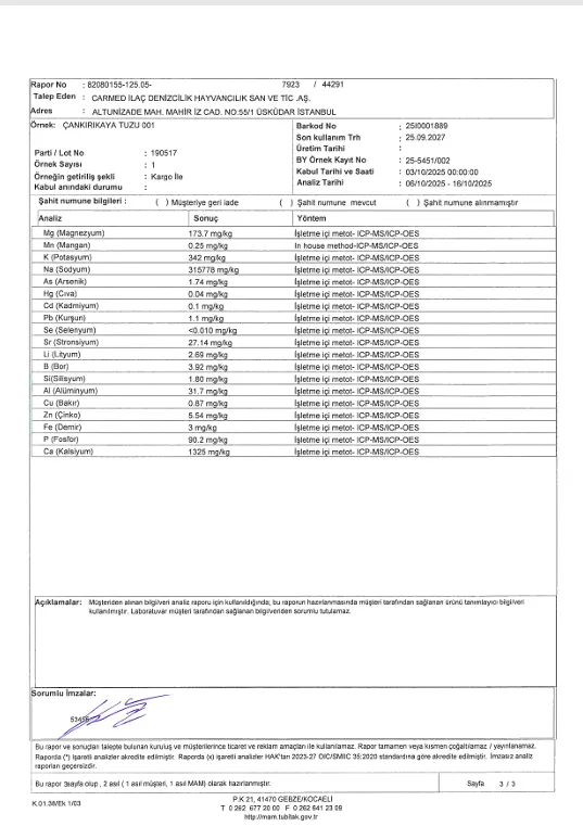gibi yüksek ve doğal olmayan oranlar gözlendi. Bu sonuçlar, ürünün yeraltı mağara tuzu değil; yüzeydeki tortul veya karışık kaynaklı tuz olabileceğini düşündürüyor.