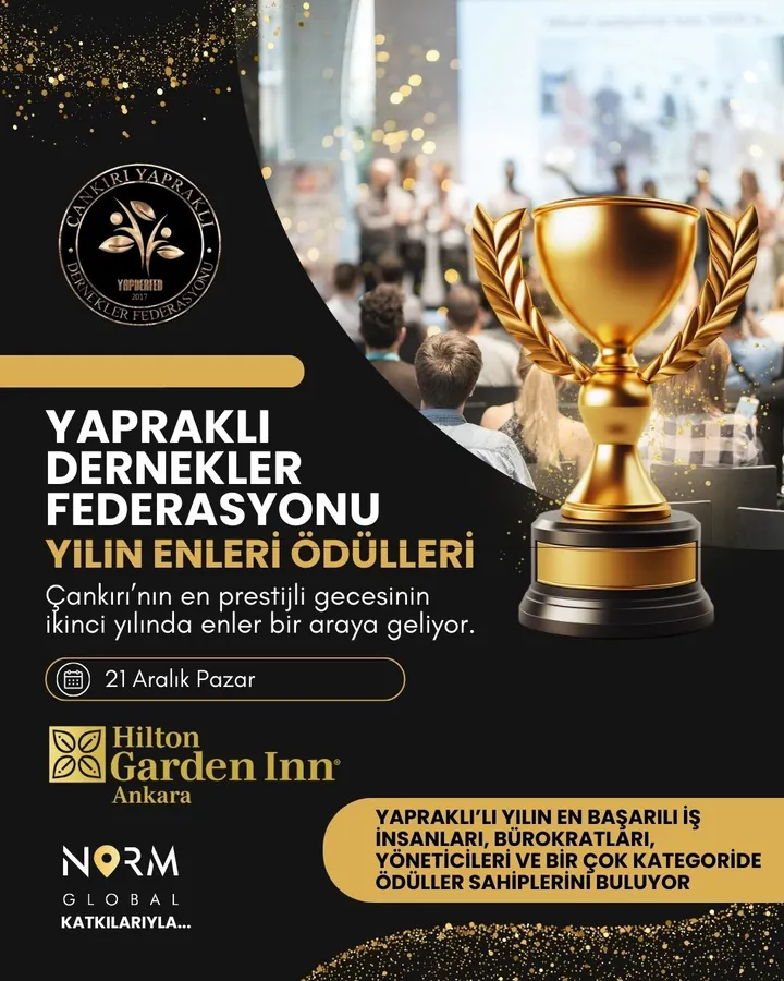 Yapraklı Dernekler Federasyonu, bu yıl ikincisini düzenleyeceği "Yılın Enleri" ödül töreni ile 2025 yılında hizmet ve başarılarıyla öne çıkan Yapraklı isimlerini bir araya getirecek. Bu özel etkinlik, 21 Aralık 2025 Pazar günü saat 19.00'da, Ankara Hilton Garden Otelinde gerçekleştirilecek.