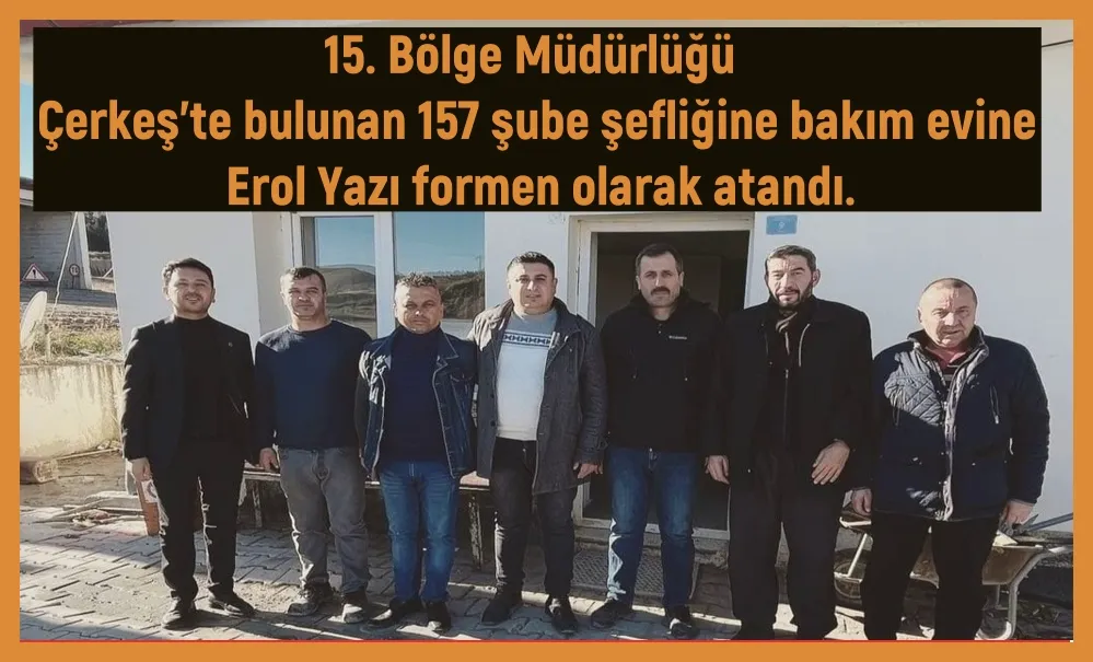 15. Bölge Müdürlüğü Çerkeş’te bulunan 157 şube şefliğine istasyon mahallesi muhtarı Erol Yazı formen olarak atandı. Kızılcahamam’dan Ilgaz’a kadar olan yerde hizmet verecek olan şube görevinde başarılar diliyoruz.