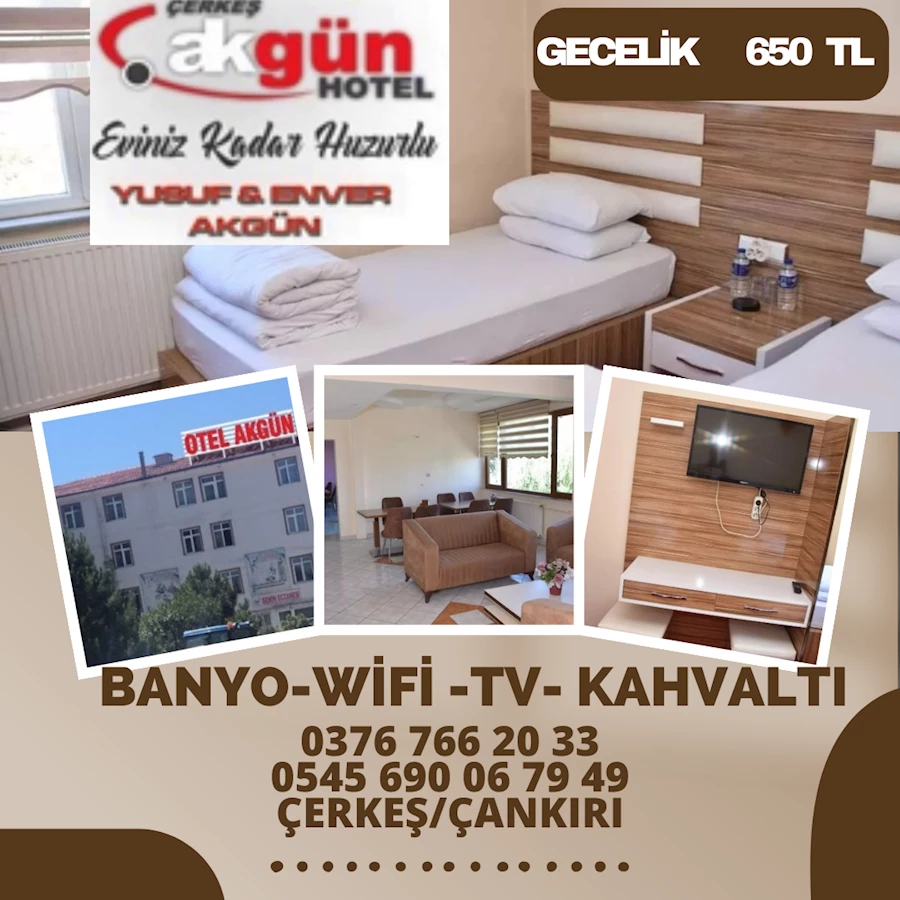 Çerkeş Akgün Otel tekrardan hizmete açıldı. Çerkeş'te uzun yıllar otelcilik sektöründe hizmet veren Akgün Otel, yerini üniversite öğrencilerinin barınmalarını karşılamak amacıyla temin etmişti.