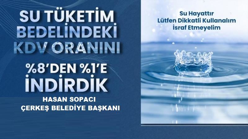Çerkeş Belediye Başkanı Hasan Sopacı, su aboneliğine yönelik yapılan vergi indirimi kararını sosyal medya hesabından duyurdu. Saygılı yaptığı paylaşımda, 'Enflasyonla mücadele kapsamında Cumhurbaşkanımız Sayın Recep Tayyip Erdoğan'ın başlattığı KDV indirimini Çerkeş şebeke suyumuzda da uyguluyoruz. Su tüketim bedelindeki KDV oranını yüzde 8'den yüzde 1'e indirdik. Çerkeş'mize hayırlı olsun' ifadesini kullandı.