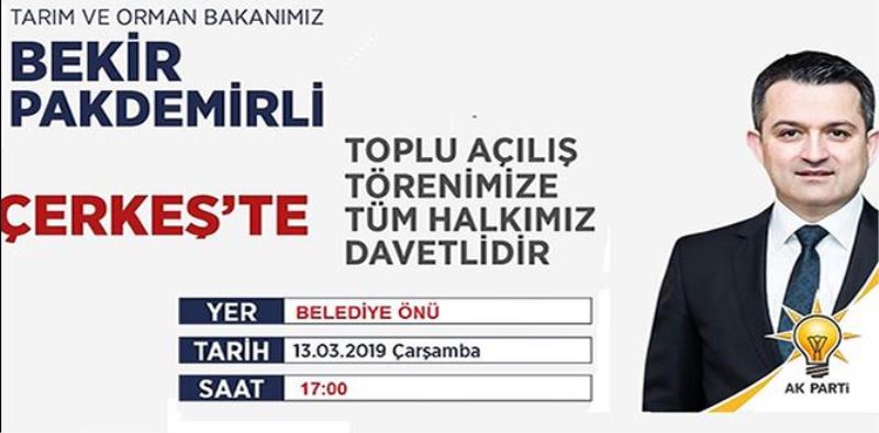 Tarım ve Orman Bakanı Dr. Bekir Pakdemirli  bir dizi ziyaretlerde de bulunmak üzere Çerkeş’e gelecek. Hasan PAŞA 5 Yıldır yaptığı hiçbir hizmet için açılış yapmamıştı.şimdi toplu halde açılış yapmak için  Bakan Dr. Pakdemirli, Çarşamba günü  saat 17 :00  Çerkeş  belediyesi  önünde halka hitap edecek ve açılış yapacak Konu ile ilgili bir açıklama yapan Çerkeş Belediye Başkan Hasan Sopacı  Tarım ve Orman Bakanımız Bekir Pakdemirli Çerkeş gelerek çeşitli açılışlarda ve ziyaretlerde bulunacak. Bakanımız, Belediye ziyareti, açılışlar ve halka hitap  törenine tüm halkımızı davet ediyorum dedi