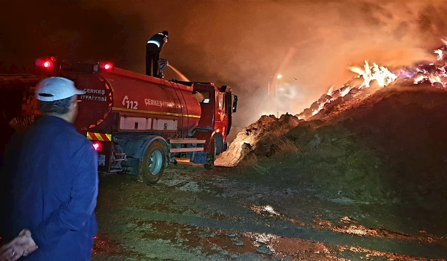 İlçemiz Türbaşı Köyünde 12.09.2023 günü saat:21.14 sıralarında bir vatandaşımızın bahçesinde doğal nedenlerden kaynaklı saman balyası yangını meydana gelmiştir. Yangında 6000 adet saman balyası yanmış olup, herhangi bir can kaybı ve yaralanma meydana gelmemiştir. Yangın söndürme çalışmaları Çerkeş Belediyesine ait Üç (3) İtfaiye ekibi ve kepçe, Saçak Belediyesine ait Bir (1) itfaiye ekibi, Kurşunlu Belediyesine ait Bir (1) itfaiye ekibi, Çerkeş Orman İşletme Müdürlüğüne ait Bir (1) adet Arazöz ve Bir (1) adet kepçe, İl Özel İdaresine ait bir (1) adet greyder, Çerkeş Beton İşletmesine ait bir (1) adet lastikli loder, Demirkapılar İşletmesine ait bir (1) adet lastikli loder, Tank Yapıya ve Reis Hafriyata ait bir (1) adet lastikli ekskavatör, Perlit İnşaat Yapıya ait bir (1) adet kepçe ile yürütülmüştür.