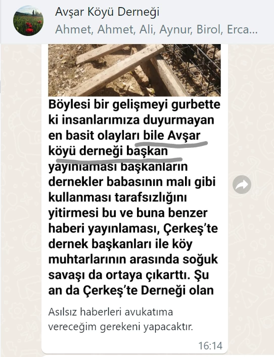 Bu güne kadar muhtar ve dernek başkanı whatsaap platformunda atışmaları imalı göndermeler köylü ile konuşurken bir birine göndermeler, köye zarar vermekte, dernek başkanı çalışmalarında ben yaptım, ben ettim, ben yapıyorum, muhtarın katkısı, yok muhtarı değişmeli gibi söylemler bulunması ortamı geriyor. Dernek başkanın egosu o kadar tavan yapmış ki köyün adına açılan whatsaap kendi ve onu destekleyenler yöneticilik vermesi işine gelmeyeni engellemesi kendi şahsi malı gibi kullanması köyü bir birine katması köyde huzursuzluk yaratmaya başladı.